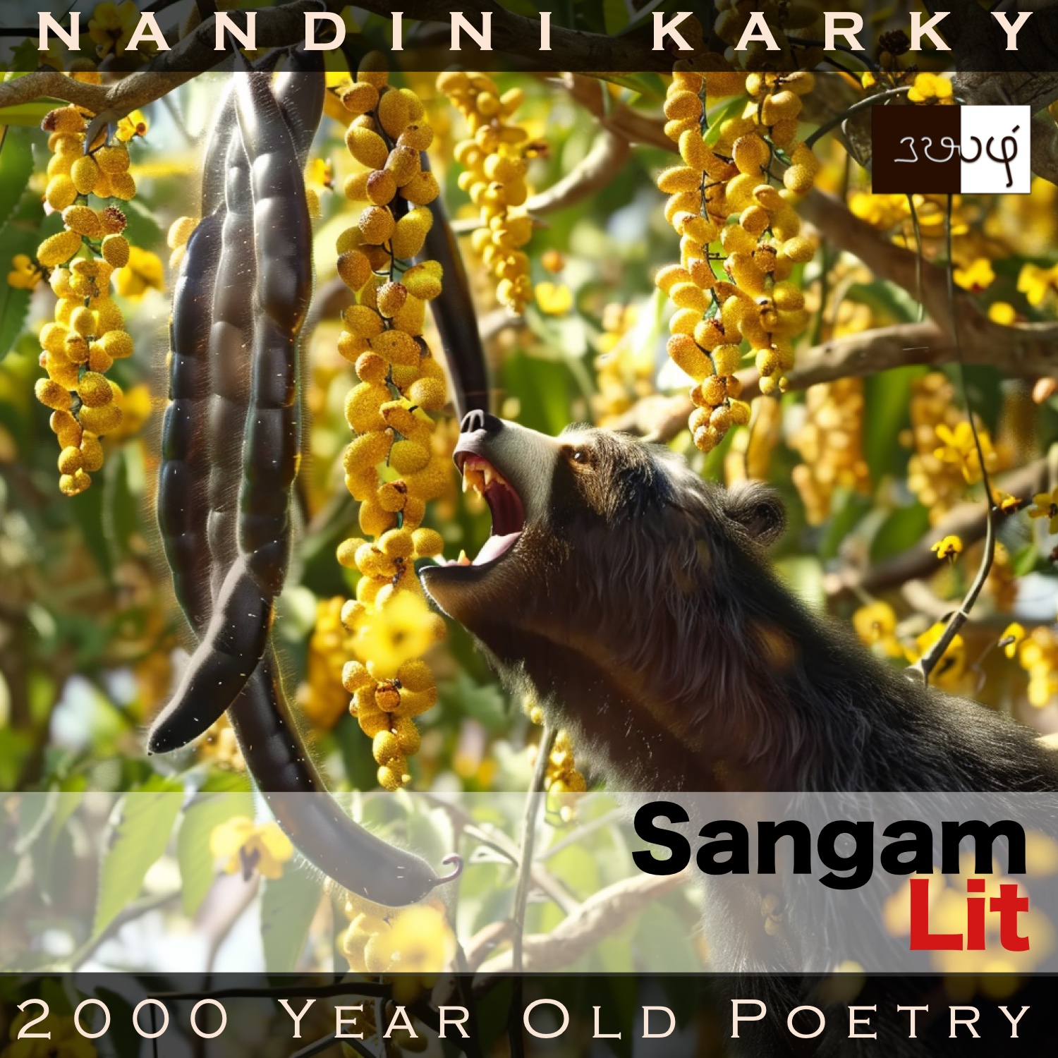 Why is the mother wishing her daughter so? Is the daughter travelling solo on account of her job? Well, being the Sangam era, such a wish comes from the mother only at the unfortunate event of an elopement by the lady with her man. Mother talks about how her daughter has left her friends and herself to lament, without the lady’s company, and crossed the stern guard of their home. Again, to describe the protection in their mansion, mother refers to the fortified walls of the Paazhi town, ruled by King Nannan. For the final segment, mother takes us to the drylands path, where we see bears feeding on Mahua flowers and tearing apart ‘Kondrai’ fruits, in a metaphor for how the lady has fed on the sweet relationship with the man and has brought distress to mother and her friends. Even so, mother concludes by recognising that her daughter left because she believed in being together with her beloved, fearing her parents would deny her that happiness.