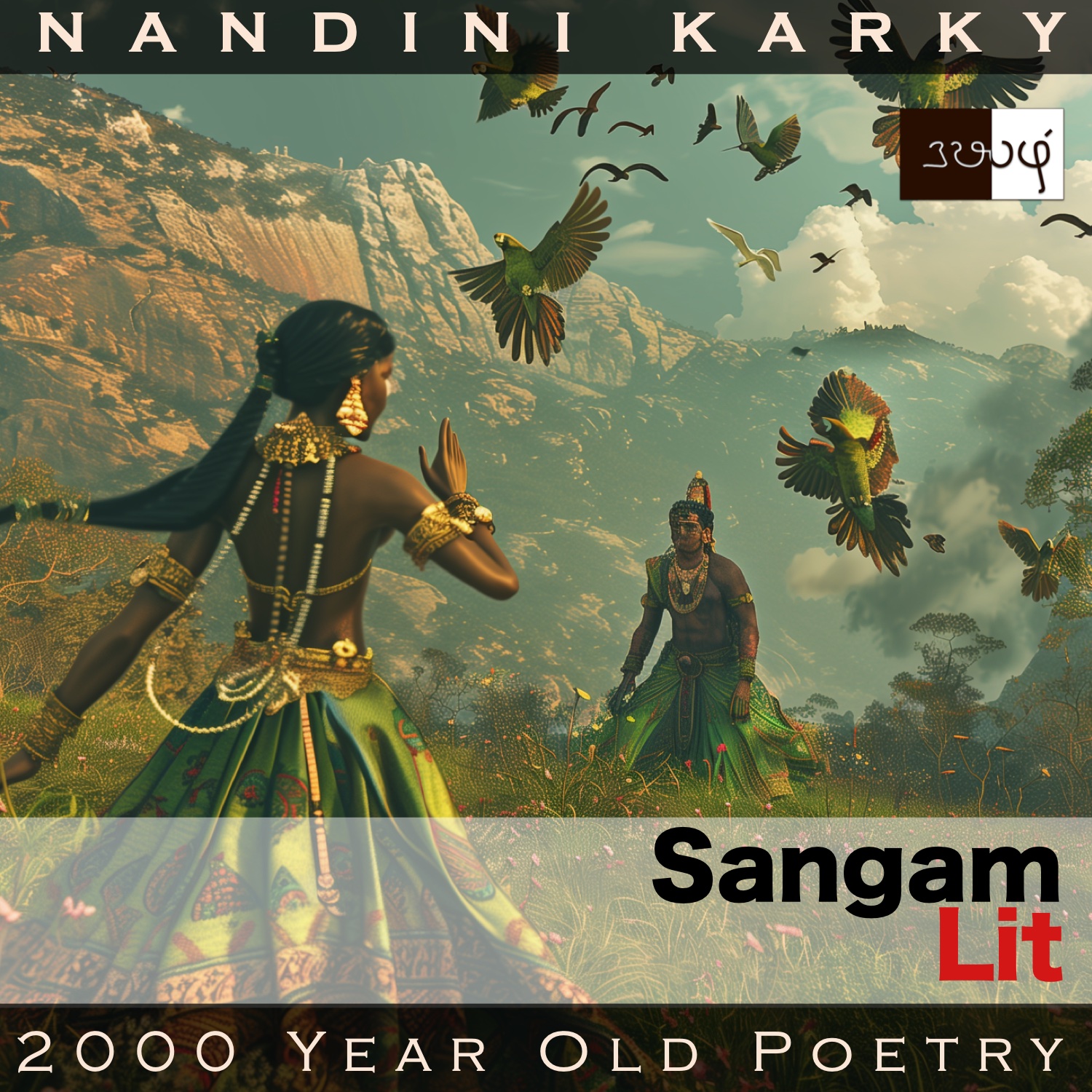 “Yesterday, a man adorned with wealthy ornaments, radiant with precious gems, appeared amidst the millet fields. In contrast to his appearance, akin to a benefactor, he spoke in the humble words of supplicants, saying, “O maiden, who chases away parrots, which come to steal away little millets, by rattling the ‘kulir’ and ‘thattai’ devices, without much strength, standing there, akin to a mountain spirit, who are you? You have bewitched me! I shall embrace you!”. Saying so, he hugged the small of my back. At that moment, akin to how hard mud softens in a downpour, my heart melted. Fearing that he would come to know of my state within, I spoke harsh words that didn’t come from my heart, and removed the clasp of his hand, and akin to a frightened female deer, stood away. Seeing this strong reaction of mine, he stood there, unable to say words any. Dejected, he soon parted away in the stance of a male elephant, shunned by its herd. He will come here today too, without fail. So, let’s go, my friend, to see how that man, who doesn’t know that my bamboo-like arms with curving wrists belong rightfully to him, as he tries to win my grace with much suffering, standing behind me. Let’s laugh at him resoundingly!”