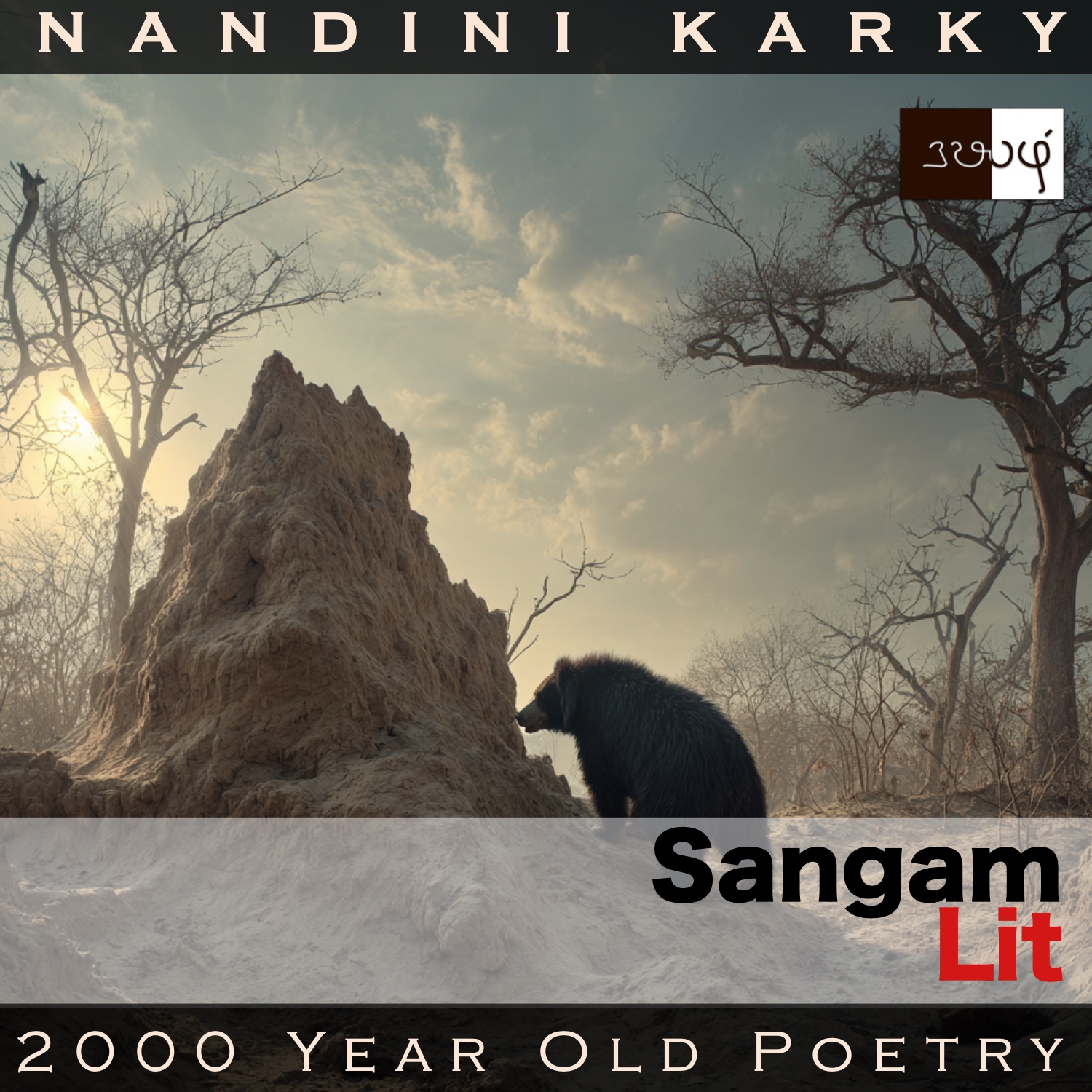 “Rising up and setting out on its daily stroll, a bear, adept at claiming its food, feeds on the sweet fruits of the Mahua tree with soaring branches, and when it starts disliking this food, the bear moves towards a termite mound with many small hollows, built by the effort of many families of white ants, working together. Nearing the wet-mouthed, tall mound, akin to an ironsmith blowing through the nozzle of the bellows, the bear breathes within, and gathers its food. In those barren places, where the earth is split into cracks, and where the sun scorches the eyes, climbing upon the upturned, dried-up branch of the burflower tree, growing near the path, a lonely eagle sits with suffering. Such is the heat-soaked, long paths of the fiery and formidable drylands. The lady’s dark and beautiful kohl-streaked eyes are akin to the town of ‘Vilangil’ ruled by the great and strong Kadalan, who overcomes shining spears of his enemies with his army of elephants in the battlefield.  To traverse those drylands, pushed by your esteemed heart, O lord, are you going to leave to earn that wealth to be made faraway, making those exquisite eyes of hers shed tears?”