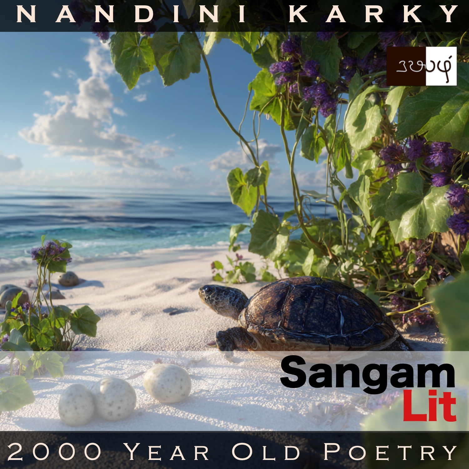 “O maiden with well-set, moist tresses, is it the same for you too? My pitiable, unfulfilled heart is shivering! Ruining the beach morning glory vines by pulling it, the pregnant turtle clears the heap of white sand in the backwaters and then hides itself before laying eggs. Then it buries the flesh-reeking eggs in the shape of ivory dice. Its mate with a split open mouth guards with devotion, until these eggs turn into hatchlings, in the orchards by the picturesque seashore in the domain of the lord.