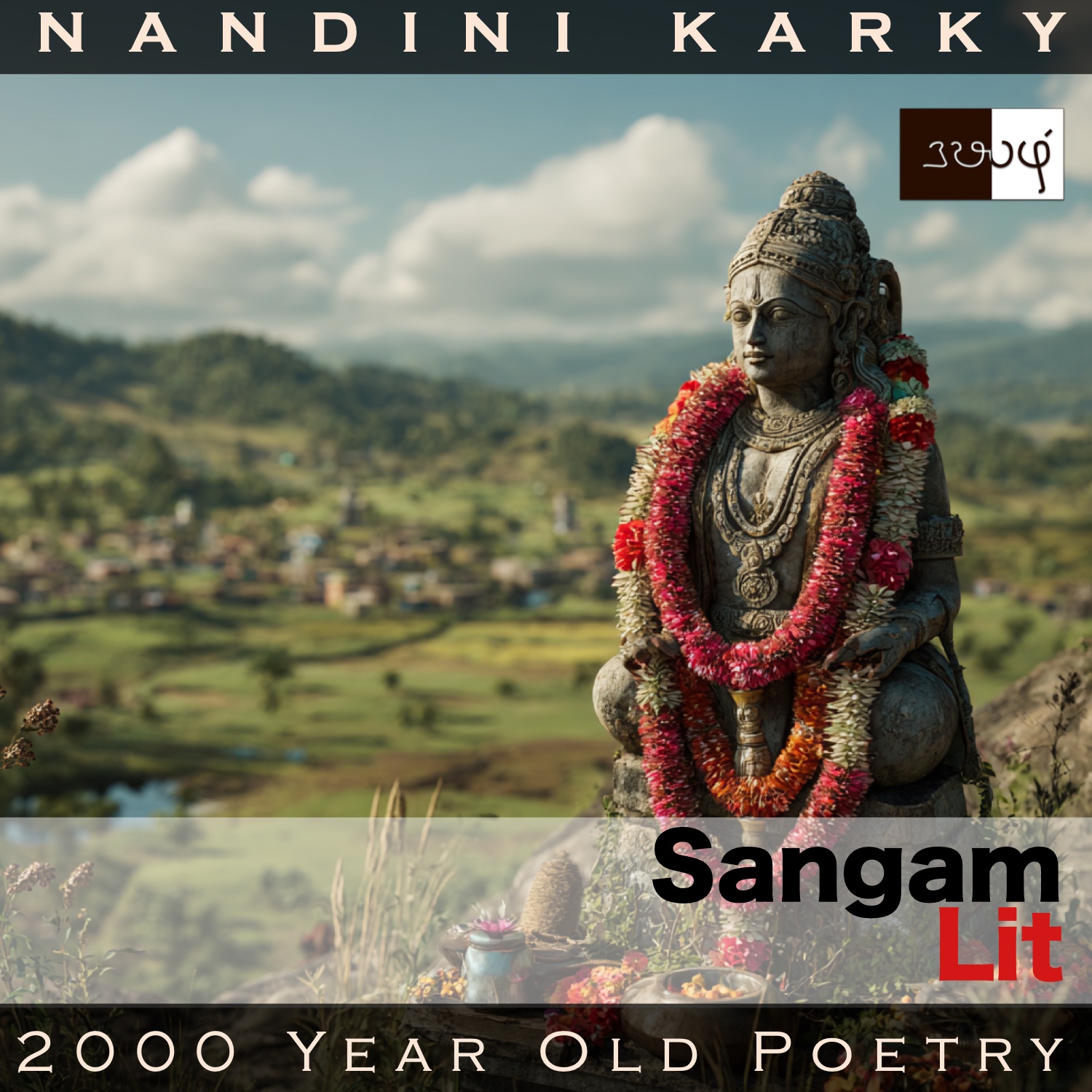 “Saying, ‘When the measuring stick breaks a jug of toddy, which had been aged for many days, the contents would shower down, confusing people as if it’s the drizzle of rainclouds, in the streets of the ancient town of Veloor, known for its heaps of paddy. At the gates of this town, striped bees fear to buzz around fragrant garlands, woven with scented buds, and fly away, seeing the huge offerings laid alongside, in front of the statue of that formidable god. O maiden with thick, flowing tresses, as you doubt, if at all I had embraced the other, let this god possess and torment me’, the lord of the town had consoled his wife, I hear. If this is true, who might that be, my friend, may you live long? The one who came yesterday, akin to a garlanded elephant, and held on to the edge of the raft, and shone like the jewel of the group, and rejoiced playing with us, as the new flood of the River Kaveri brimmed over the shores?”